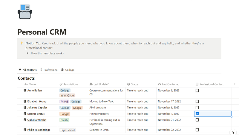 11. Document your progress. You might want to keep things organised by documenting your progress or tracking the people you’ve connected with. A simple spreadsheet will do. You can also use Notion’s personal CRM or your notes app.